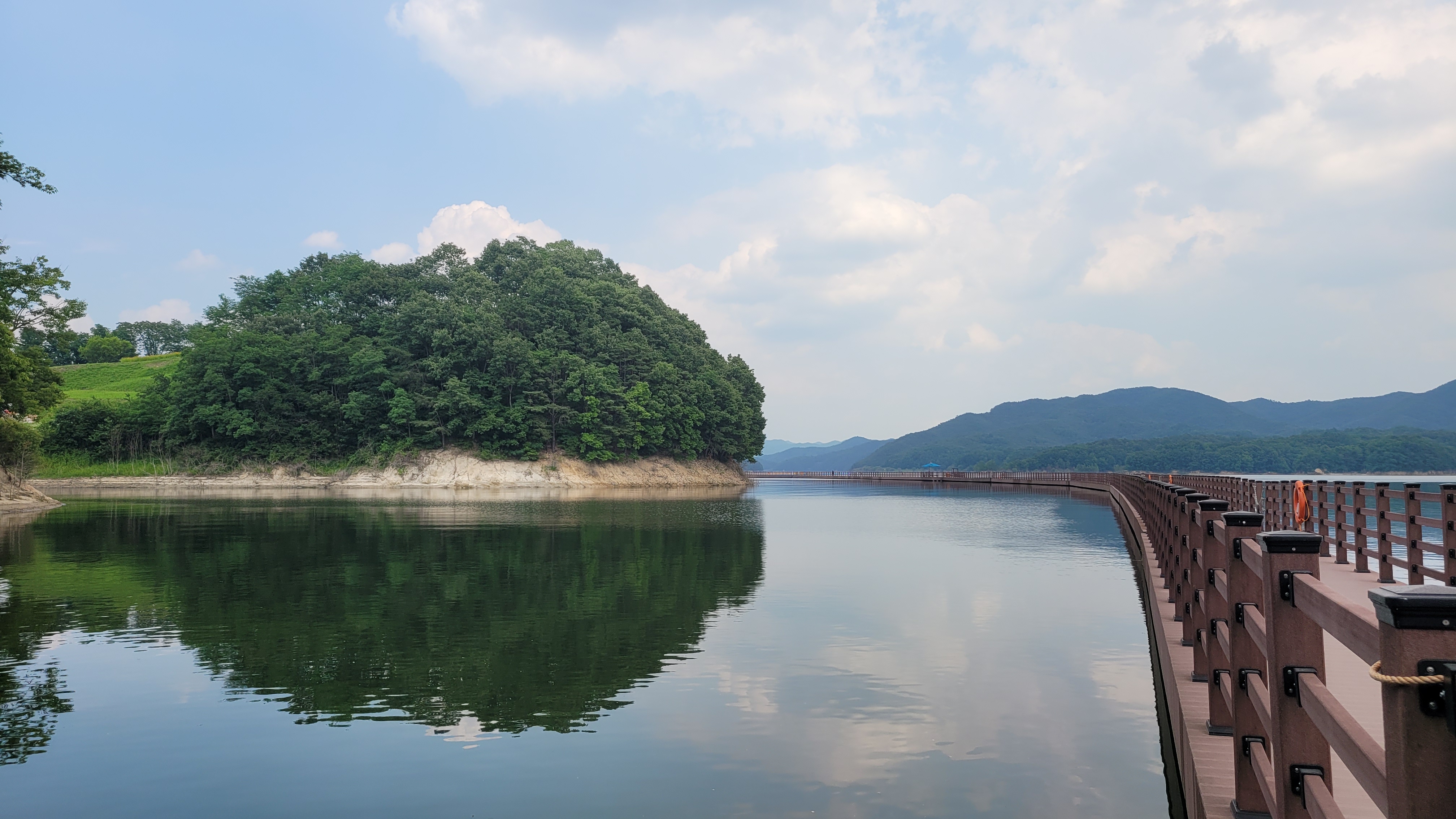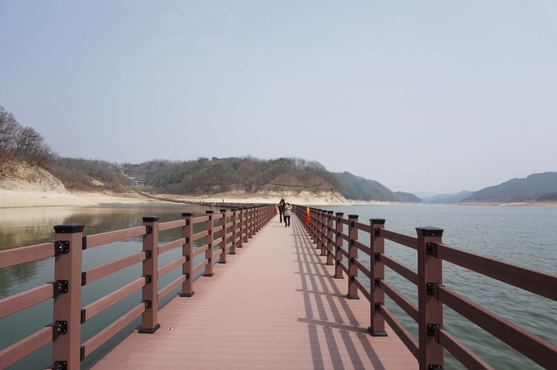 또 물이 많고 적음에 따라 부교의 높낮이도 달라져요. 좋은 사람과 아울러 이 데크길을 산책하게되면 더할 나위 없이 안동호를 온몸으로 깨닫을 수 있는 코스인 셈이예요. 선성 수상길 중간에는 1974년 안동댐 건설로 수몰된 예안 국민학교를 추억하는 공간이 풍금과 책걸상, 그리고 물속으로 사라져버린 마을 흑백사진으로 손질되어져 있다는데 그곳이 바로 예안 초등학교가 있던 위치라고요.